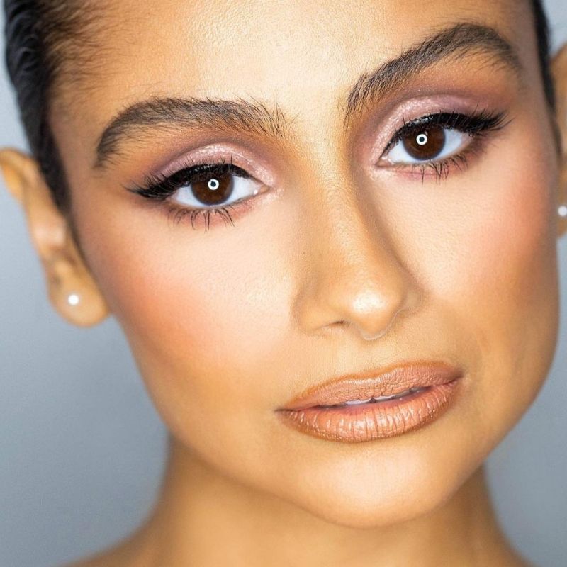 Dale un toque bronceado difuminando sombras nude mate en el pliegue del párpado y cubriendo tus párpados con un tono marrón claro brillante. La clave está en el delineador de labios nude y el labial bronce perfecto para perfeccionar tus labios nude. ¡Complétalo con un brillo labial brillante e iluminador en el arco de Cupido para un bronceado definitivo!